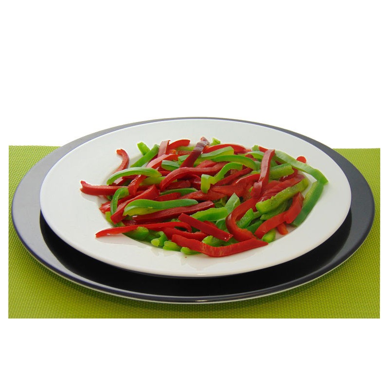 Mezcla de pimientos rojos y verdes cortados en tiras. Ideal para utilizar en guarniciones o mezclar con otros ingredientes.