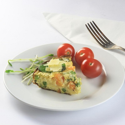 Batimos los huevos en un cuenco grande, añadimos la nata líquida y batimos con una pizca de sal y otra de pimienta. Incorporamos el calabacín y la cebolla así como las verduras cocidas.